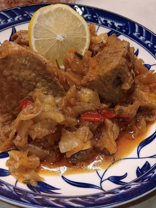 Μετά έριξα λίγο κόκκινο κρασί, ένα ξερό κρεμμύδι κομμένο σε κομματάκια, λίγο κόκκινη πιπεριά, δύο κόκκους μπαχάρι, λίγο ρίγανη, αλάτι, πιπέρι, 100 γρ. πουμαρό, λίγη ζάχαρη.
