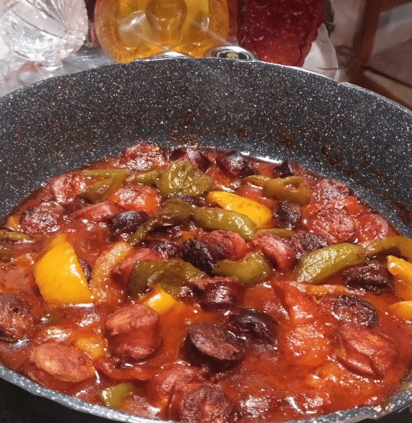 Σε ένα φαρδύ τηγάνι ζεσταίνουµε το ελαιόλαδο και σοτάρουµε τις πιπεριές µαζί µε το λουκάνικο µέχρι να ροδίσουν.