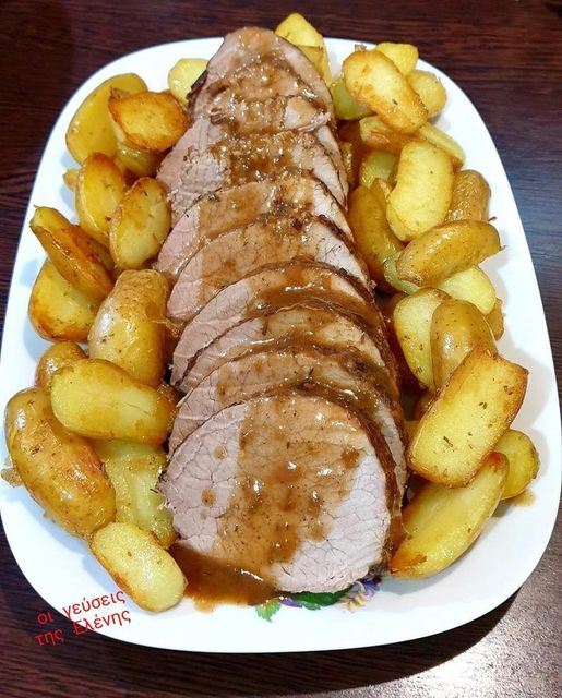 Αφήνουμε το φαγητό να βράσει και το μεταφέρουμε σε ένα μακρόστενο πυρέξ. Κλείνουμε με λαδόκολλα και αλουμινόχαρτο και ψήνουμε για 2 ώρες στους 170° C στον αέρα, γυρίζοντας το κρέας κατά διαστήματα ώστε να βρέχεται από τα υγρά του και να σιγοψήνεται. Όταν το βγάλουμε, το αφήνουμε σκεπασμένο να σταθεί για 20 λεπτά.