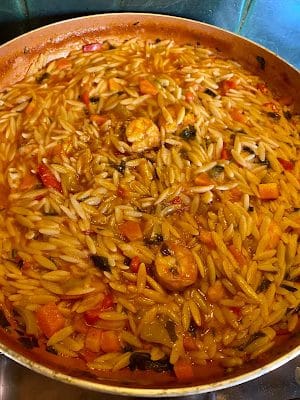 Σοτάρουμε για 2 λεπτά και προσθέτουμε τις γαρίδες, αφού προηγουμένως τις έχουμε καθαρίσει. Συνεχίζουμε το σοτάρισμα για άλλα 5 λεπτά περίπου.