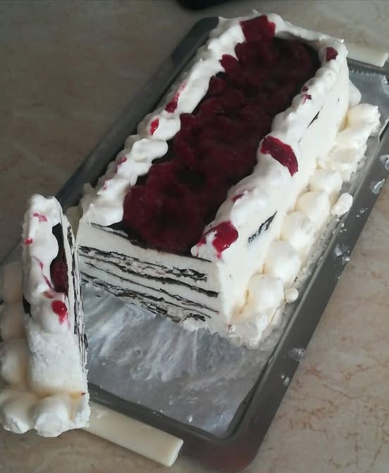 Τοποθετήστε μια λαδόκολλα στη φόρμα του κέικ και βάλτε την πρώτη πλάκα σοκολάτας. Ρίξτε λίγο από το μείγμα της κρέμας. Επαναλάβετε τη διαδικασία για άλλες πέντε φορές, μέχρι να τελειώσουν οι πλάκες σοκολάτας.