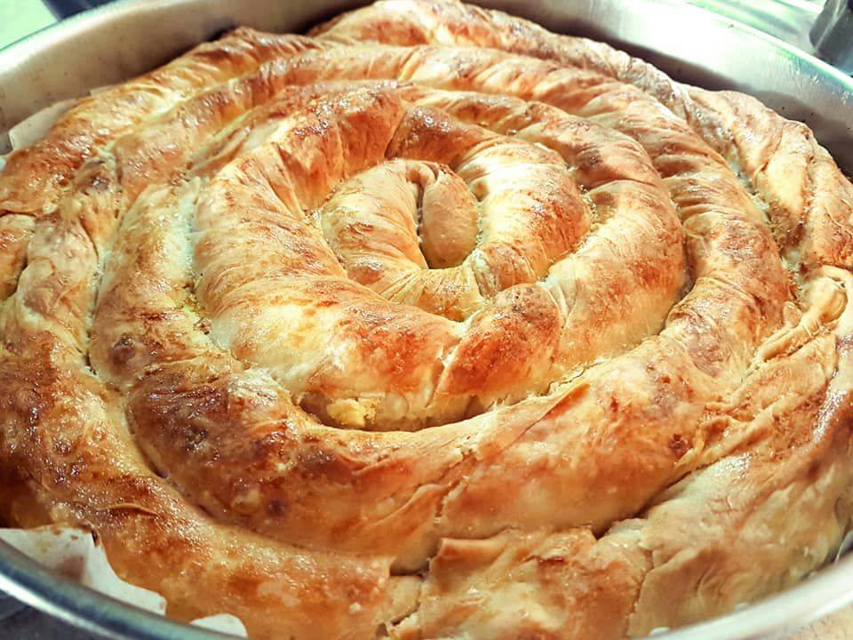 Την χωρίζουμε σε 10 ή 12 μπαλάκια τα οποία ανά δύο βουτυρώνοντας τα ανοίγουμε φύλλο.