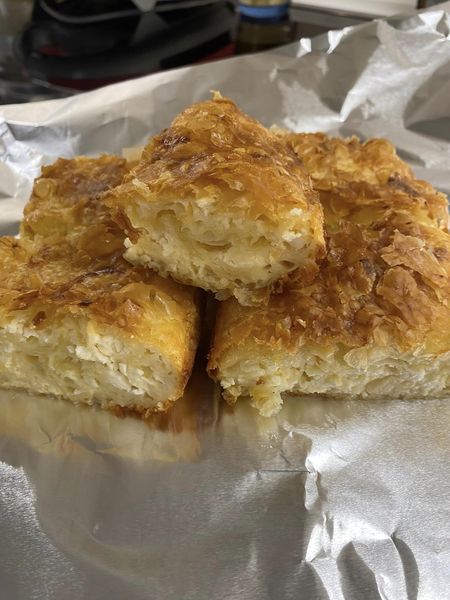 Συνεχίζουμε μέχρι να τελειώσει το τυρί και το βούτυρο, κρατάμε δύο φύλλα για το τέλος να σκεπάσουμε την πίτα και τέλος χαράζουμε την πίτα χωρίς να βγει το μαχαίρι κάτω στον πάτο, χτυπάμε τα αυγά, την κρέμα και το γάλα και περιχύνουμε την πίτα μας και ρίχνουμε και το υπόλοιπο βούτυρο που μας έμεινε.
