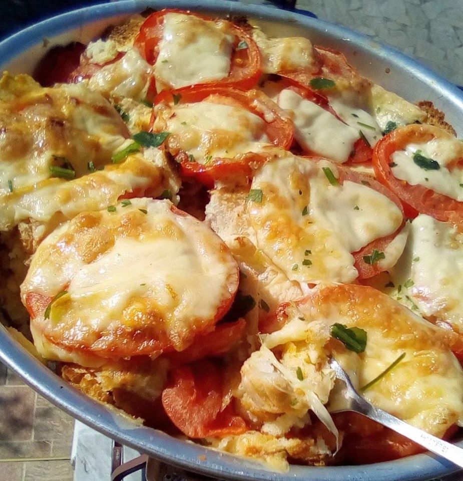 Συνεχιζουμε τοποθετουμε ξανα φετες ψωμιου ριχνουμε μιγμα με το κουταλι να μουσκεψουν καλα τοποθετουμε φετες ντοματας τριμμενο κασερι,φετες κασερι πανω στην καθε ντοματα και το ψηνουμε στους 250 βαθμους μεχρι να λιωσει το κασερι να παρει λιγο χρωμα