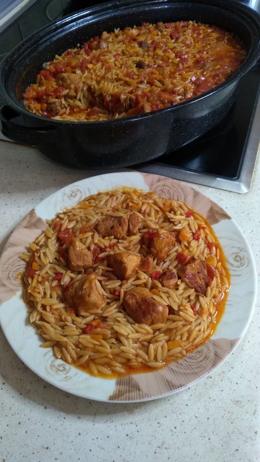 Σε ένα ταψί βάζουμε όλο το περιεχόμενο της κατσαρόλας, προσθέτουμε το κριθαράκι και νερό βραστό(αν χρειάζεται), και ψήνουμε στο φούρνο στους 200 βαθμούς για 20 έως 25 λεπτά περίπου ελέγχουμε το νερό βάζουμε πάντα ζεστό.