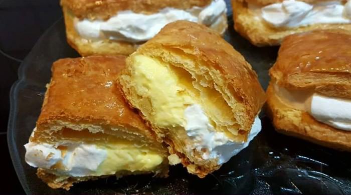 Αρχικά, ανοίγουμε 2 φύλλα σφολιάτας. Τοποθετούμε το ένα πάνω στο άλλο και τα πιέζουμε ελαφρά ώστε να ενωθούν, χωρίς να τα παραμορφώσουμε. Με τη μεγάλη πλευρά της σφολιάτας στραμμένη προς εμάς, κόβουμε τη σφολιάτα οριζόντια στη μέση. Στη συνέχεια, κόβουμε κάθετα σε τέσσερα κομμάτια, με αποτέλεσμα να έχουμε συνολικά 8 κομμάτια σφολιάτας. Παίρνουμε το κάθε κομμάτι και στρογγυλεύουμε τις γωνίες, ώστε να μοιάζουν με “γλώσσες” ζαχαροπλαστείου. Τοποθετούμε τις σφολιάτες σε ένα ταψί που έχουμε καλύψει με αντικολλητικό χαρτί και ψήνουμε σε προθερμασμένο φούρνο στους 180° για 10-12 λεπτά.