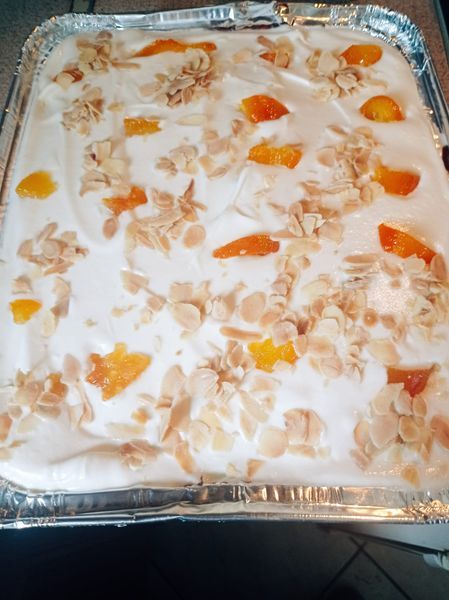 Ύστερα λίγο φιλέ αμυγδάλου πού λίγο εψησα στο φούρνο. Και διακόσμηση με λίγο γλυκό του κουταλιού πορτοκάλι .