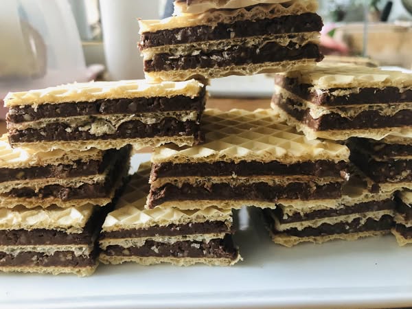 Τέλος, προσθέτουμε τα αλεσμένα φουντούκια και ανακατεύουμε καλά. Σε μια μεγάλη ξύλινη βάση, τοποθετούμε ένα φύλλο γκοφρέτας και με μια σπάτουλα απλώνουμε το μείγμα. Επαναλαμβάνουμε τη διαδικασία με ένα φύλλο και μια στρώση από το μείγμα μέχρι να εξαντληθούν όλα τα υλικά.