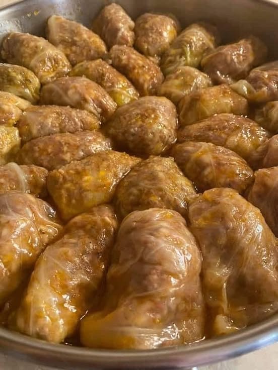 Στη συνέχεια, σε ένα τηγάνι, σοτάρουμε το κρεμμύδι με το ελαιόλαδο μέχρι να γίνει διάφανο. Προσθέτουμε τις σάλτσες και στη συνέχεια τον κιμά, ανακατεύοντας καλά. Αφήνουμε το μείγμα να ψηθεί για λίγο και μετά το βγάζουμε από τη φωτιά. Προσθέτουμε τα μπαχαρικά και το ρύζι, ανακατεύουμε και τυλίγουμε το μείγμα σε φύλλα λάχανου.