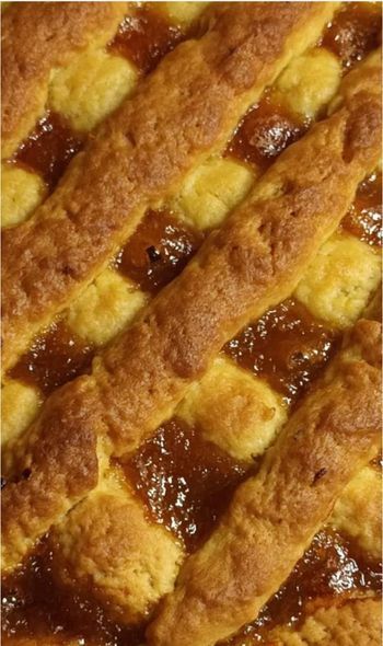 Μοιράζουμε την ζύμη σε 2 ίσα ίσα μέρη, λαδώνουμε τσέρκι και στρώνω την μισή ζύμη, ρίχνουμε ομοιόμορφα την μαρμελάδα και καλύπτουμε την επιφάνεια με μπαστουνάκια.
