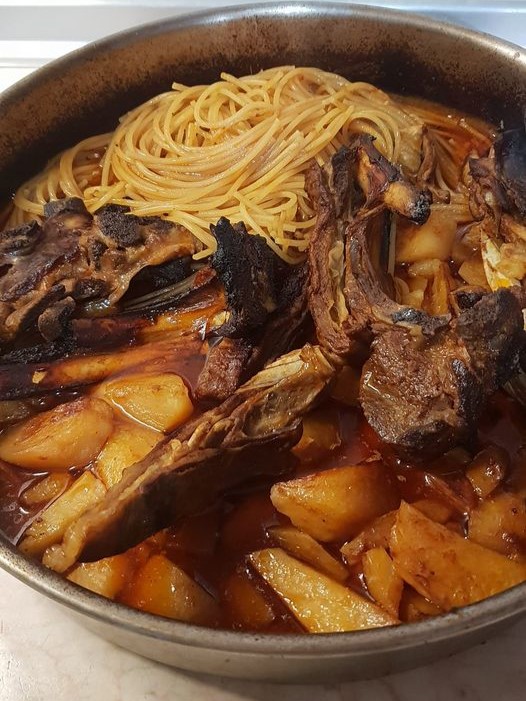 Αφήνουμε να μελώσει και να γίνει λουκουμάκι, 1 ώρα νωρίτερα πριν γίνει αυτό ρίχνουμε πατάτες, δεν ανακατεύουμε, απλά αφήνουμε να ψηθούν, στη συνέχεια αφού γίνει το φαγητό προσθέτουμε νεράκι κανένα δύο ποτήρια παραπάνω.