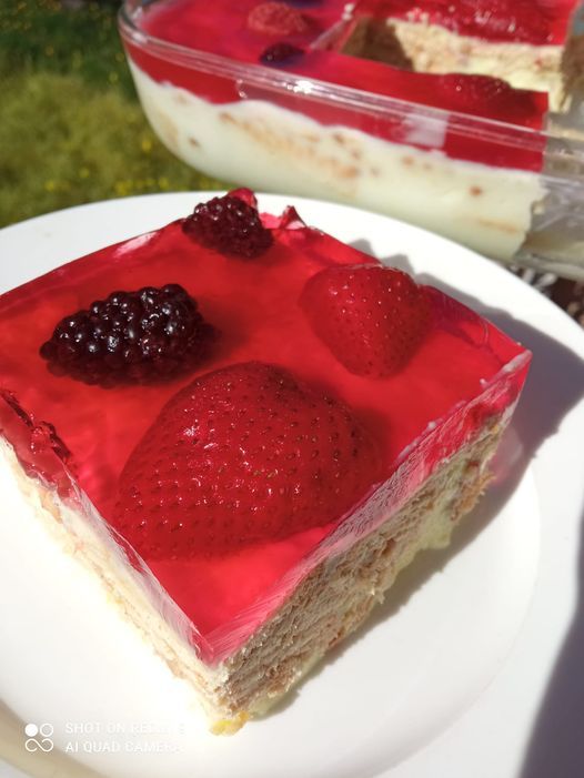 Βάζουμε πάνω φρούτα και τελειώνουμε φτιάχνοντας το ζελέ όπως αναγράφει η συσκευασία και το βάζουμε λίγο στο ψυγείο να πήξει ελαφρώς και το ρίχνουμε πάνω