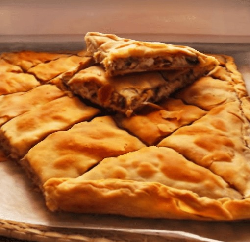 Γυρνάμε της γωνίες προς τα έξω, Με ένα μαχαίρι κόβουμε όχι μέχρι τέλος, την πίτα και λαδώνουμε και πασπαλίζουμε με λίγο νεράκι από πάνω. Το ψήνουμε σε προθερμάσμενο φούρνο στους 180 βαθμούς μέχρι να ψηθεί και να πάρει ωραίο χρώμα Στα σχόλια είναι οι φωτογραφίες φτιαγμένης πίτας.