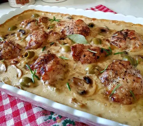 Αυτό το ψητό κοτόπουλο με μανιτάρια, κρεμμύδι, σκόρδο και βότανα, ψημένο σε κρεμώδη σάλτσα λευκού κρασιού είναι ένα εύκολο και γευστικό πιάτο που είναι επίσης φιλικό με χαμηλούς υδατάνθρακες!