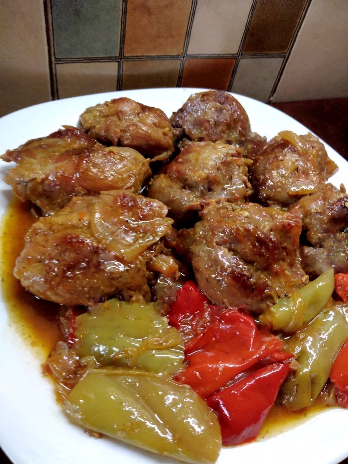 Μόλις μαλακώσουν προσθέτουμε ελαιόλαδο, 1 κρεμμύδι σε μεγάλα μισοφέγγαρα, κομμάτια πράσινης και κόκκινης πιπεριάς και 2 σπασμένες σκελίδες σκόρδο. Τσιγαρίζουμε μέχρι να πάρουν χρώμα.