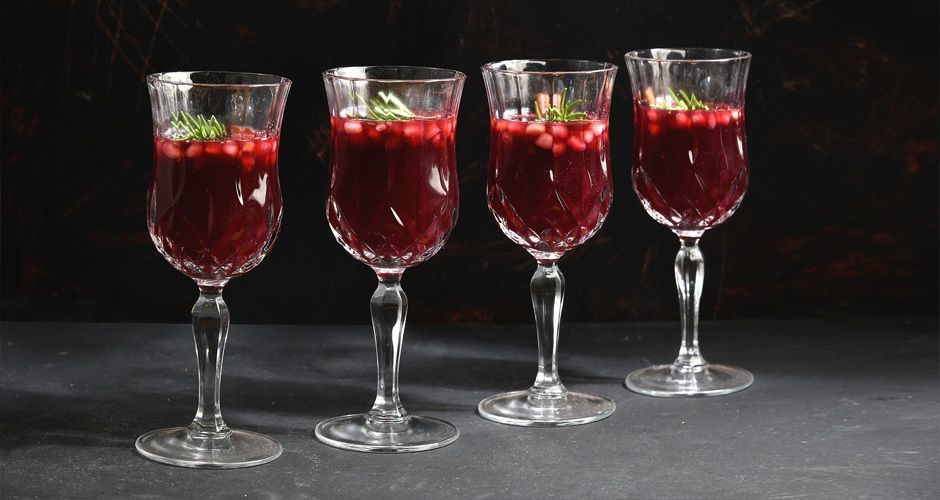 Μεταφέρουμε το κρασί σε ποτήρια και σερβίρουμε με ρόδι, στικ κανέλας και δεντρολίβανο.