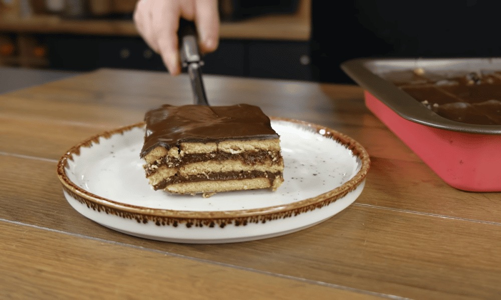 Βουτάμε τα μπισκότα σε ένα μίγμα από το νερό και μαρμελάδα που έχουμε ανακατέψει και τα τοποθετούμε σε ένα ταψί 25Χ30 εκατοστά.