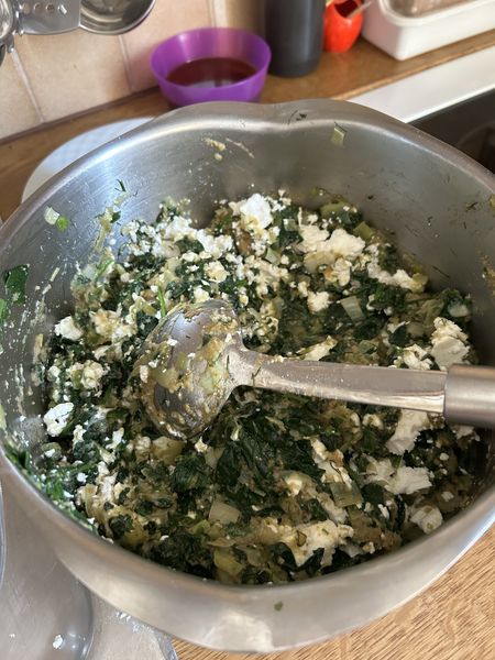 Υπολογίστε λοιπόν τα 300 γραμ νερό και αν είναι σκληρή προσθέστε λίγο ακόμα αν κολλάει θέλει λίγο αλεύρι. Χωρίστε την ζύμη σε 8 μπαλάκια και σκεπάστε τα με μια πετσέτα μέχρι να κάνετε την γέμιση.
