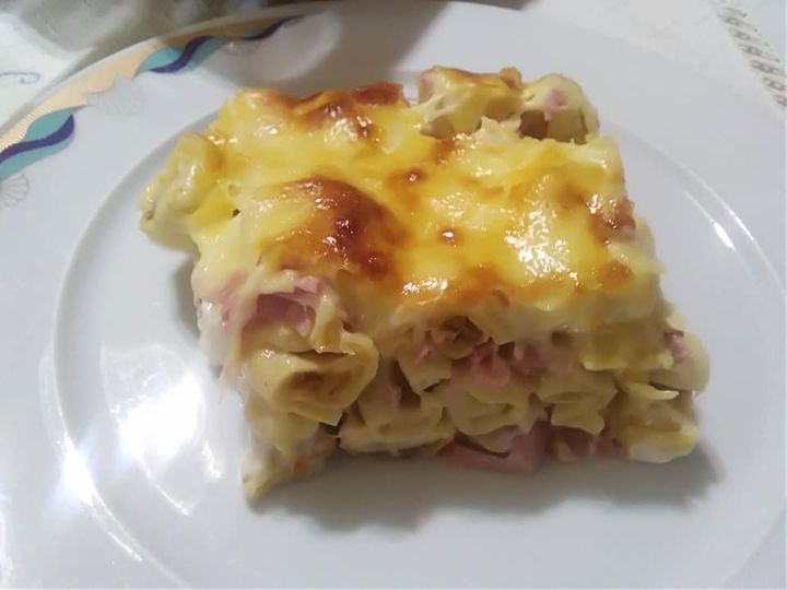 Προσθέτουμε τα αλλαντικά, την μια κρέμα γάλακτος, τα τυριά κρατώντας μια ποσότητα για να ρίξουμε στην επιφάνεια, ανακατεύουμε και τα αδειάζουμε στο ταψί.