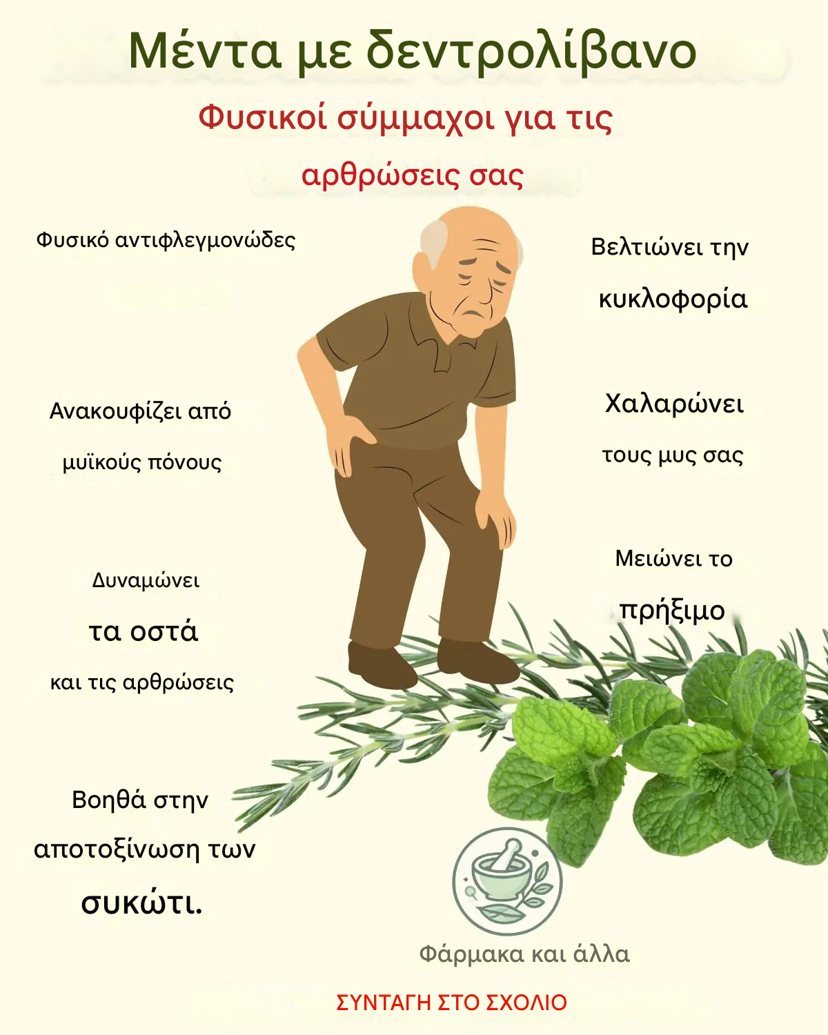 Ψάχνετε για μια φυσική λύση για την ανακούφιση από τον πόνο στις αρθρώσεις; 🌿Ο πόνος στις αρθρώσεις μπορεί να είναι μια περιοριστική εμπειρία, αλλά η φύση μας προσφέρει ισχυρούς συμμάχους. Σε αυτό το άρθρο, θα εξερευνήσουμε πώς η μέντα και το δεντρολίβανο, δύο φυτά με εξαιρετικές ιδιότητες, μπορούν να γίνουν οι καλύτεροι σύντροφοί σας στην ανάκτηση της ευλυγισίας και της ευεξίας. Ανακαλύψτε πώς να τα ενσωματώσετε με ασφάλεια στην ρουτίνα σας!🌱