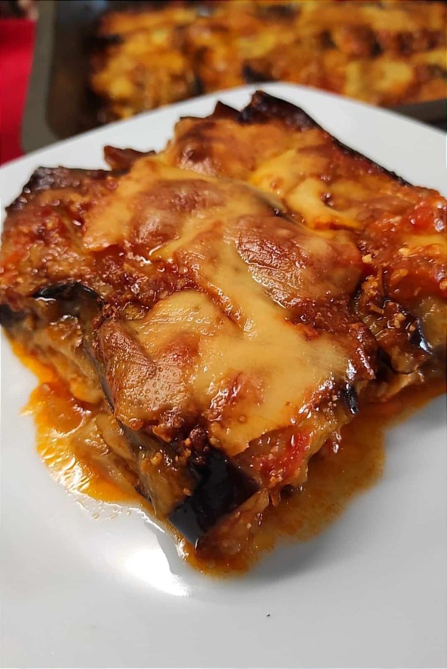 Στην κορυφή, κόβουμε το γκούντα σε μικρά κομμάτια ώστε να φαίνεται και η μελιτζάνα. Τέλος, ψήνουμε στο φούρνο για περίπου 40 λεπτά στους 180 βαθμούς Κελσίου με αντιστάσεις.