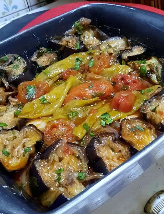 Προτηγάνισα 2 μεγάλες μελιτζάνες και 4-5 πρ. πιπεριές, τις έβγαλα σε απορροφητικό χαρτί κουζίνας.
