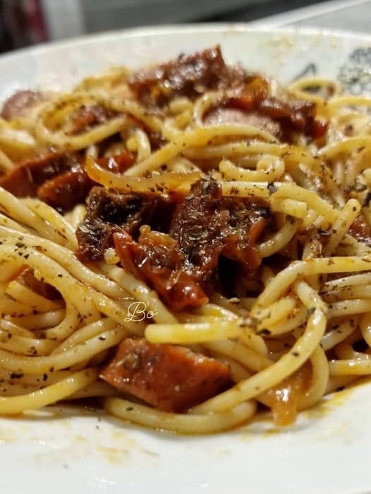 Σε ένα κατσαρολάκι, ξεκινάμε ζεσταίνοντας λίγο ελαιόλαδο σε μέτρια φωτιά. Στη συνέχεια, προσθέτουμε ένα μέτριο κρεμμύδι κομμένο σε λεπτές φέτες, το οποίο θα δώσει γεύση και άρωμα στο πιάτο μας. Ακολουθεί το χωριάτικο λουκάνικο, κομμένο σε ροδέλες Στη συνέχεια, ρίχνουμε λιαστές ντομάτες κομμένες σε μικρότερα κομμάτια και μία μεγάλη σκελίδα σκόρδου ψιλοκομμένη, που θα ενισχύσει τη γεύση της σάλτσας.