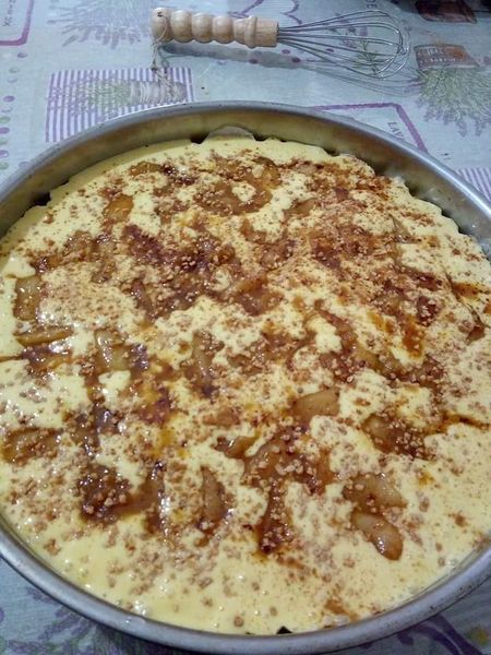 Ρίχνουμε το κέικ και από πάνω κουταλιά- κουταλιά τα μήλα. Πασπαλίζουμε λίγη κανέλα και αμυγδαλάκι πραλίνα.