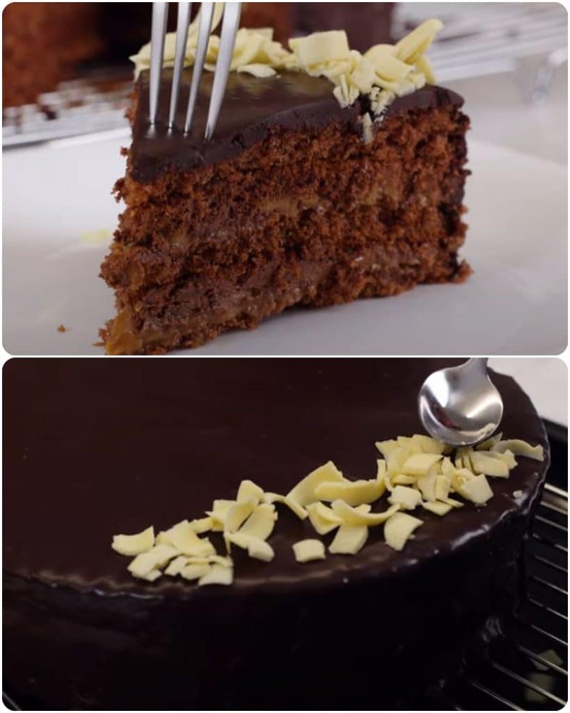 Στρώνουμε το ένα παντεσπάνι στο ταψάκι, το πασπαλίζουμε με γάλα, απλώνουμε το μισό καραμελωμένο ζαχαρούχο και κατόπιν την μισή μους σοκολάτας.
