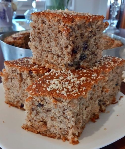 Προσθέτουμε μισή κούπα σταφίδες μαύρες 1μιση κουπα καρύδια τριμ.1 κιλό αλεύρι Αλλατίνη μπλε και 1 φακελάκι μπεικιν.