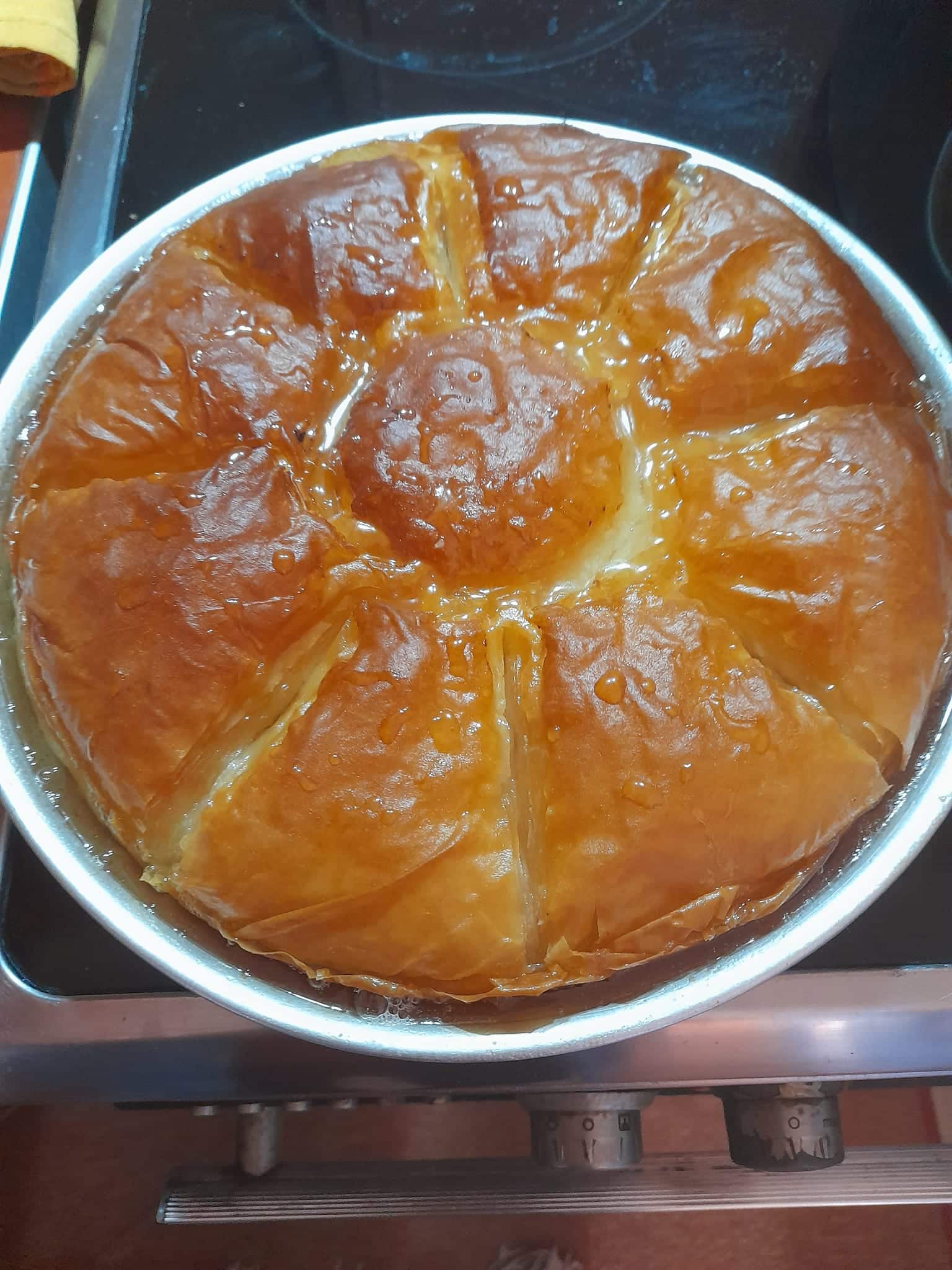 Να συμπληρώσω ότι στρώνουμε 4 φύλλα βουτυρωμένα χιαστί βάζουμε την κρέμα και γυρίζουμε τα φύλλα βουτυρονωντας και τελειώνουμε με άλλα 3 φύλλα κομμένα στρογγυλά βάζοντας τα μέσα γύρω γύρω πιέζοντας με το πινελο
