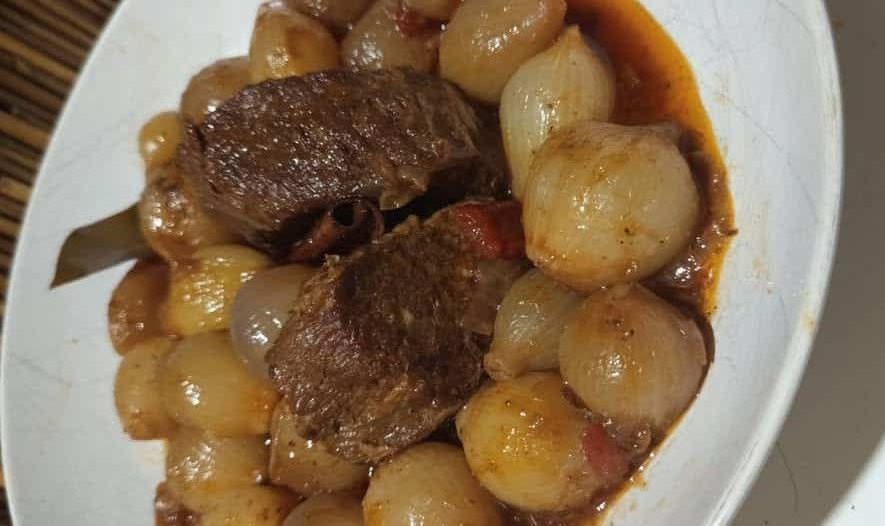 Προσθέτω ένα κιλό κρεμμυδάκια για στιφάδο που είχα ήδη ζεματίσει και καθαρίσει.
