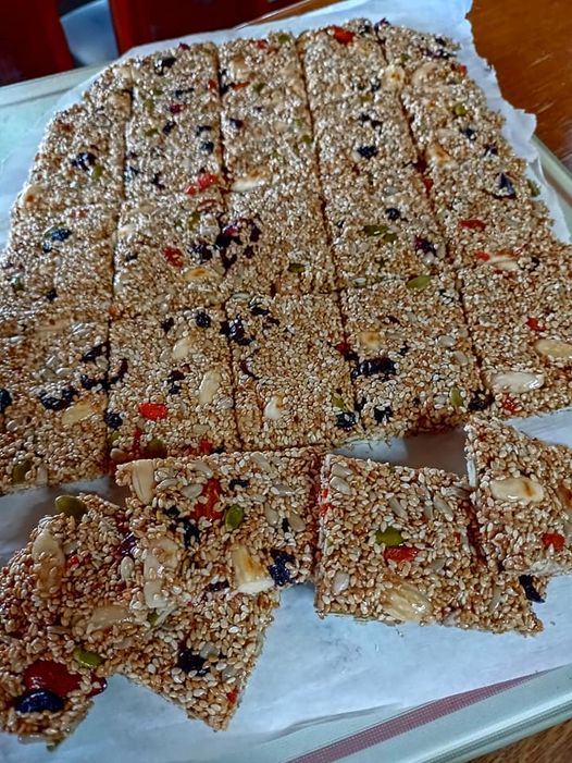 Στο ίδιο τηγάνι βάζω το μέλι μόλις λιώσει ρίχνω το σουσάμι τούς ξηρούς καρπούς και τα Κραμπερι.