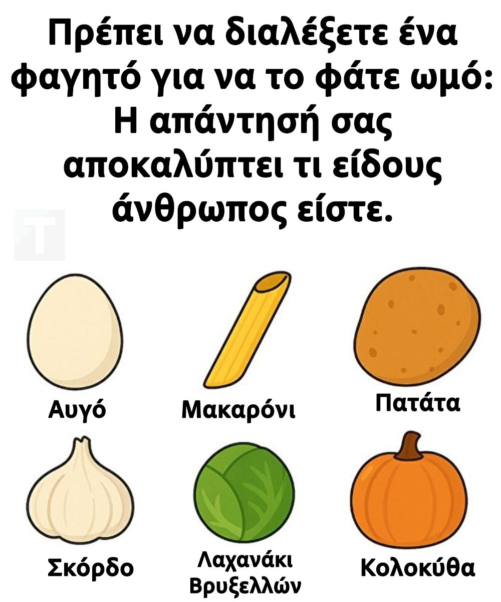 Μερικές φορές, οι πιο απλές ερωτήσεις αποκαλύπτουν τις πιο απρόσμενες αλήθειες. Φανταστείτε ότι πρέπει να διαλέξετε ένα από τα παρακάτω φαγητά για να το φάτε ωμό: Αβγό, Μακαρόνι, Πατάτα, Σκόρδο, Λαχανάκι Βρυξελλών ή Κολοκύθα.