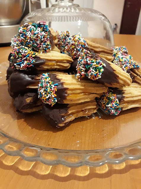 Βουτάμε τα κουλουράκια μέχρι τη μέση στη λιωμένη σοκολάτα και αφήνουμε σε μία σχάρα να κρυώσουν. Αν θέλουμε τα πασπαλίζουμε και με τρουφάκια. Όταν κρυώσουν καλά τα παίρνουμε και με τη βοήθεια ενός κορνέ, βάζουμε μαρμελάδα στο ένα μπισκότο από την «εσωτερική» του πλευρά και καπακώνουμε με ένα άλλο κουλουράκι και ουσιαστικά κάνουμε ένα sandwich με τα 2 κουλουράκια μας.