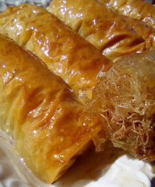 Αρχικά, ξεκινάμε με την προετοιμασία του κανταΐφι. Απλώνουμε 300 γρ κανταΐφι σε ένα ταψί, φροντίζοντας να είναι ομοιόμορφα κατανεμημένο.