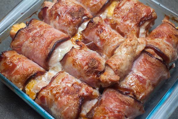 Τυλίγετε κάθε μπουκίτσα κοτόπουλου σφιχτά με μία φέτα μπέικον και τυρί, και τοποθετείτε τα κοτομπέικον σε ένα πυρέξ.