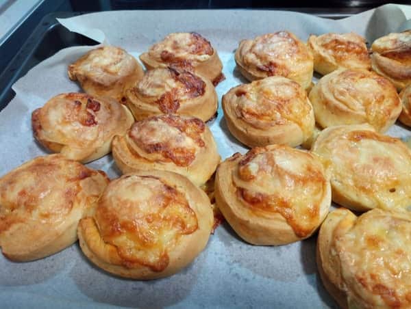 Τυλίγω σε ρολό και κόβω σε κομμάτια. Τοποθετώ τα κομμάτια σε αντικολλητικό χαρτί και ψήνω σε προθερμασμένο φούρνο στους 180 βαθμούς μέχρι να χρυσαφίσουν.