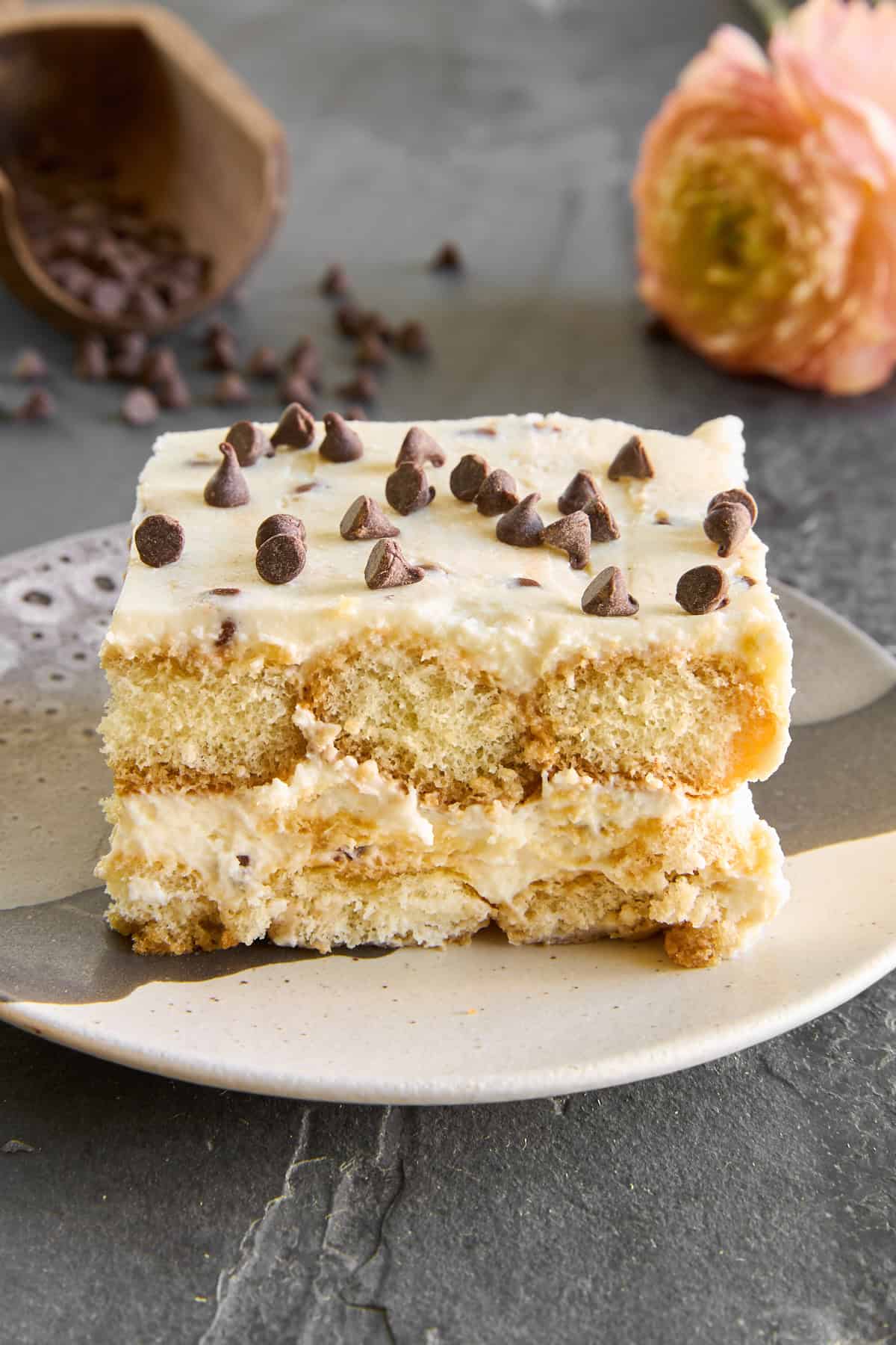 Μια φέτα τιραμισού κανόλι με κομματάκια σοκολάτας σε ένα πιάτο.