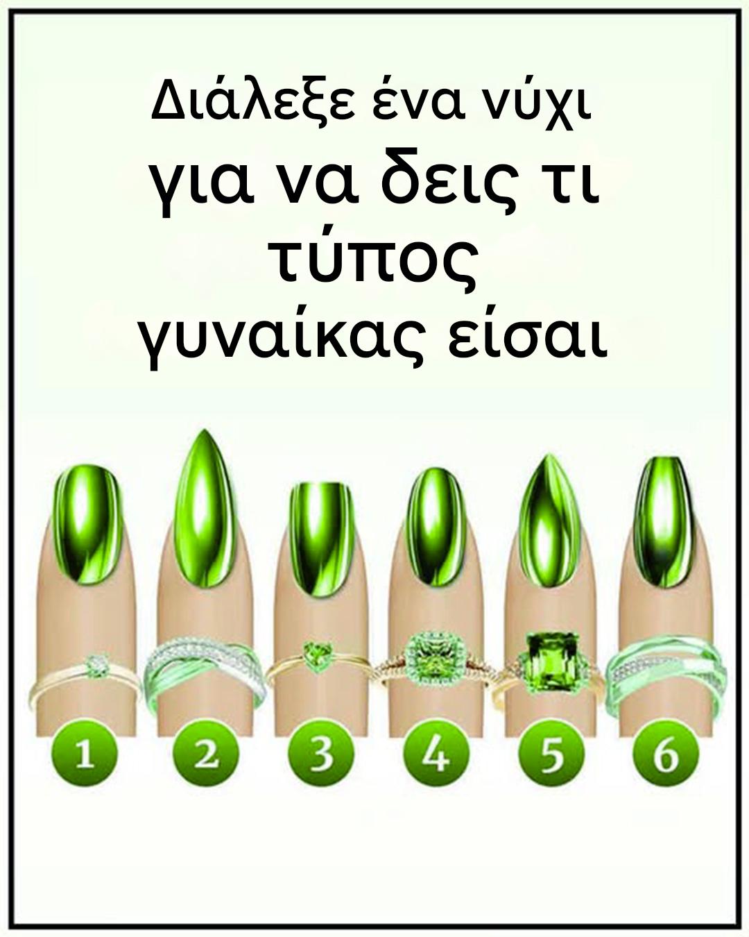 Το στυλ των νυχιών σας λέει πολλά για εσάς. Ναι, διαβάσατε σωστά! Απλώς παρατηρώντας ένα σχήμα νυχιών που σας τραβάει αμέσως, αυτό το μοναδικό τεστ προσωπικότητας μπορεί να σας εκπλήξει ευχάριστα. Επιλέξτε αυτό που σας αρέσει περισσότερο από τα έξι σχήματα παρακάτω… και ανακαλύψτε τι αποκαλύπτει για τα δυνατά σας σημεία, τις αδυναμίες σας και τι πραγματικά έχει σημασία για εσάς στη ζωή.
