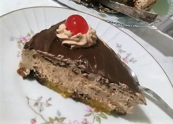 Χτυπάω μια φυτική σαντιγί 500γρ παγωμένη και συνεχίζω το χτύπημα βάζοντας 300 γρ πραλινα φουντουκιού χωρίς ζάχαρη την απλώνω επάνω στη βάση και κρατώ λίγο για στολισμό
