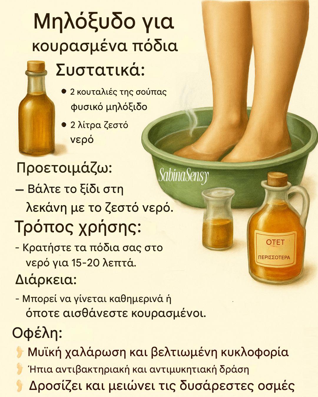 🍏 Το μηλόξιδο δεν είναι μόνο ένα συστατικό της κουζίνας, αλλά και μια απλή και αποτελεσματική θεραπεία για τη φυσική περιποίηση των ποδιών. Μετά από μια κουραστική μέρα, ένα ζεστό μπάνιο με μηλόξιδο μπορεί να κάνει θαύματα: χαλαρώνει τους μύες, βελτιώνει την κυκλοφορία του αίματος και εξαλείφει την αίσθηση βάρους στα πόδια.