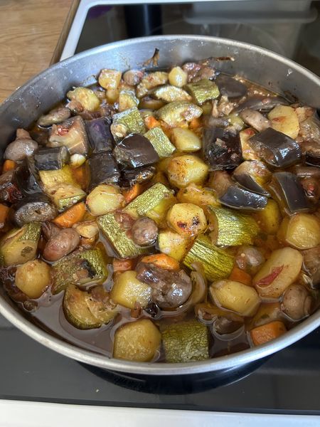 2 μελιτζάνες φλάσκες κομμένες σε κομμάτια μεσαίου μεγέθους, 2 μεγάλα κολοκύθια κομμένα το ίδιο με την μελιτζάνα, 15 πατάτες μίνι, αυτές είχα σπίτι), 1 κουτί άσπρα μανιτάρια, 1/2 ματσάκι μαϊντανό, (τα φύλλα), 2 καρότα σε μισά κομμάτια γιατί ήταν παχουλά, αλάτι, πιπέρι, λάδι, 1 κύβο λαχανικών, 1 κρεμμύδι σε φέτες, 2 σκελίδες σκόρδο ψιλοκομμένες, 3 μεγάλες τομάτες τριμμένες και 1 συσκευασία χυμό τομάτας.