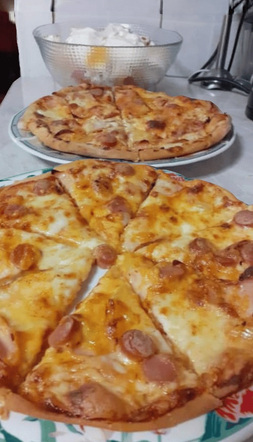 Αφήνω σκεπασμένο σε ζεστό μέρος να φουσκώσει 1-2 ώρες! Χωριζω την ζυμη σε τρια μπαλακια!Παίρνω ένα μπαλάκι ζύμης το βάζω σε λαδωμενο ταψακι το απλώνω με το χέρι να πάει παντού βάζω κάτω 2-3 κ.σ σάλτσα ντομάτας και έβαλα γαλοπούλα λουκανικάκια πιπεριά και τυριά που λιώνουν γκουντα τσένταρ μοτσαρελα.
