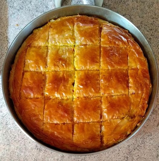 Χαράσσουμε την πίτα σε κομμάτια και ψήνουμε στους 200°C με αντιστάσεις για περίπου 45 λεπτά.