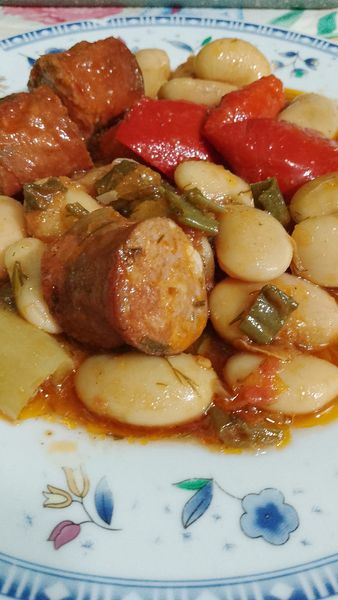 Σε ταψί βάζουμε λάδι, ένα κρεμμύδι ψιλοκομμένο, σκόρδο λιωμένο, κρεμμυδάκια ψιλοκομμένα, άνιθο ψιλοκομμένο, μάραθο ψιλοκομμένο, πιπεριές πράσινες και κόκκινες κομμένες σε χοντρές φέτες, λουκάνικο χωριάτικο κομμένο σε χοντρές ροδέλες, τριμμένες ντομάτες, λίγο πελτέ, αλάτι, πιπέρι και τους βρασμένους γίγαντες μαζί με λίγο από το νερό που έβρασαν.