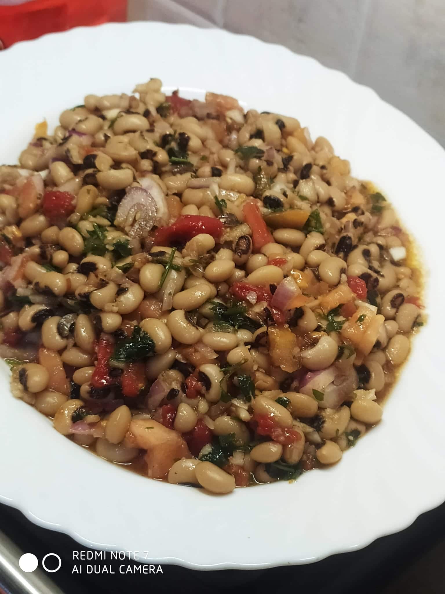 Ρίχνουμε τα φασόλια μέσα σε ένα μπολ και κόβουμε μία ντομάτα σε κύβους 1 κρεμμύδι σε κύβους ψημένη πιπεριά Φλωρίνης σε κύβους άνηθο λίγο αλάτι και κρέμα μπαλσάμικο επίσης και λίγο λάδι είτε από τις πιπεριές Φλωρίνης είτε ελαιόλαδο