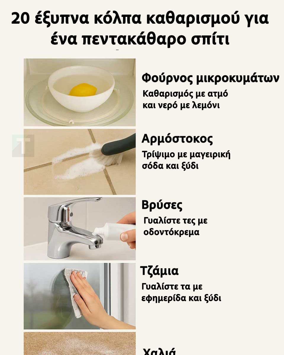 Αυτά τα κόλπα χρησιμοποιούν κοινά οικιακά αντικείμενα, μετατρέποντάς τα σε πανίσχυρα εργαλεία καθαρισμού. Είτε αντιμετωπίζετε επίμονους λεκέδες, φρεσκάρετε χώρους είτε θέλετε μια αστραφτερή κουζίνα, αυτά τα 20 κόλπα καθαρισμού DIY θα σας βοηθήσουν να πετύχετε ένα πεντακάθαρο σπίτι χωρίς κόπο.