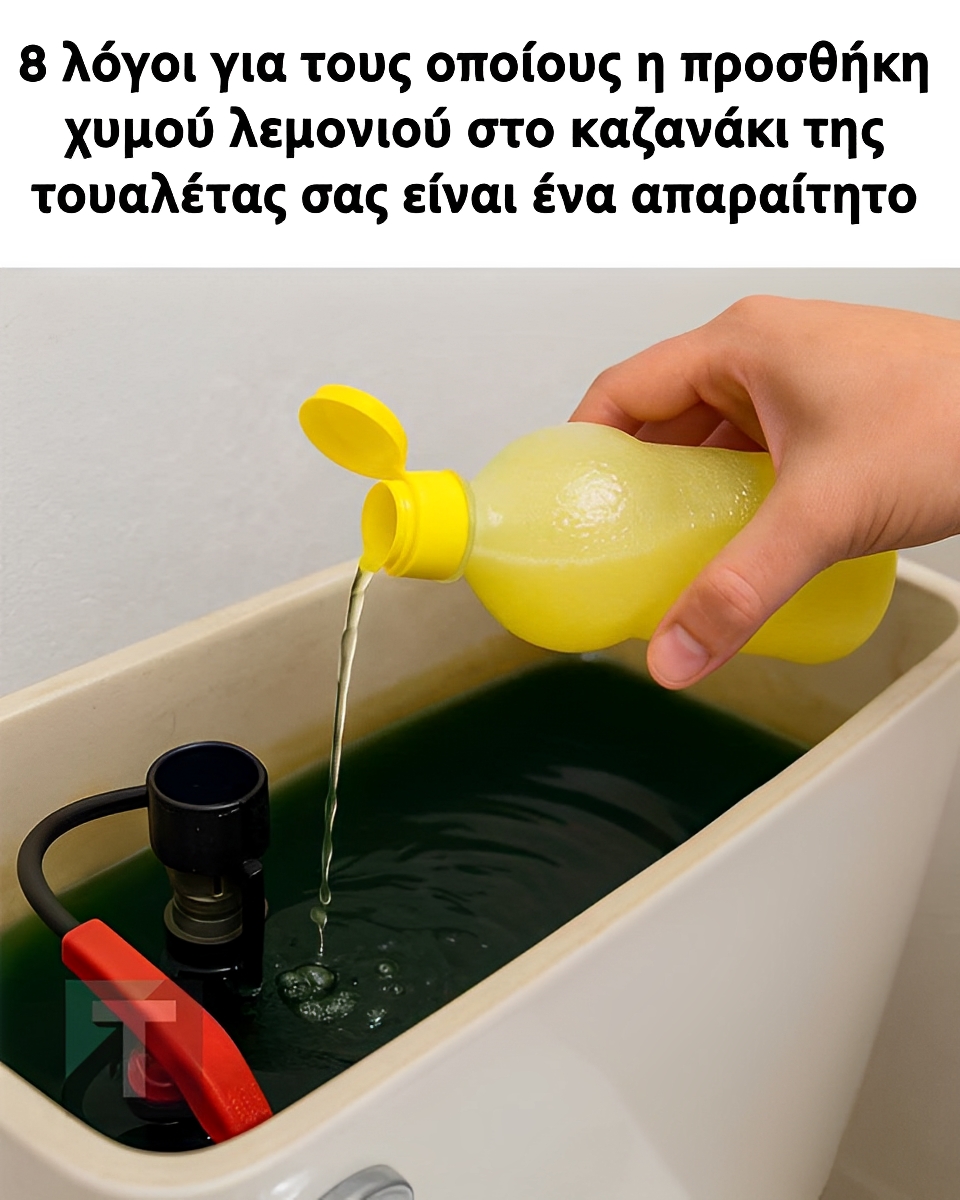 Ο χυμός λεμονιού, ένα βασικό προϊόν σε πολλές κουζίνες, δεν χρησιμοποιείται μόνο για μαγειρικούς σκοπούς. Προσφέρει πολλα πλεονεκτήματα όταν χρησιμοποιείται στο καζανάκι  της τουαλέτας σας. Από τις φυσικές καθαριστικές του ιδιότητες έως το αναζωογονητικό του άρωμα, ο χυμός λεμονιού είναι μια εύκολη και οικολογική εναλλακτική λύση στα σκληρά χημικά.Διαβάστε παρακάτω  οκτώ πειστικούς λόγους για τους οποίους η προσθήκη χυμού λεμονιού στη καζανάκι της τουαλέτας σας είναι ένα απαραίτητο κόλπο για κάθε νοικοκυριό.
